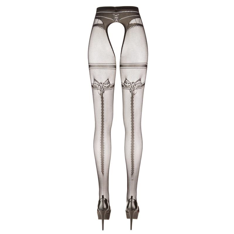 Seidig weiche Netzstrumpfhose ouvert mit eingewebtem Strumpfband und Ziernaht hinten.
