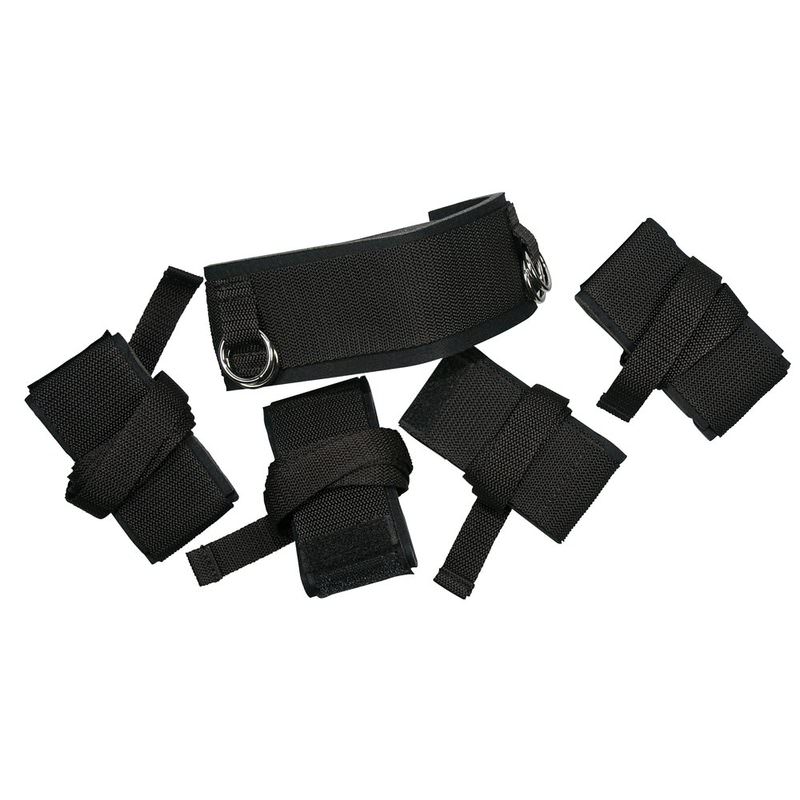 Reißfeste schmale Bänder verbinden die gepolsterten Hand- und Fußfesseln mit der Halsfessel. Die Bänder (132 cm) sind in der Länge so verstellbar, dass eine fast aufrechte Haltung möglich ist oder aber der/die Gefesselte gekrümmt ausharren muss. Auch die Arme sind (einzeln) in individueller Position fixierbar. Alle Fesseln mit Klettverschlüssen.