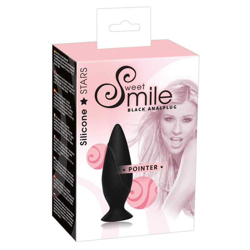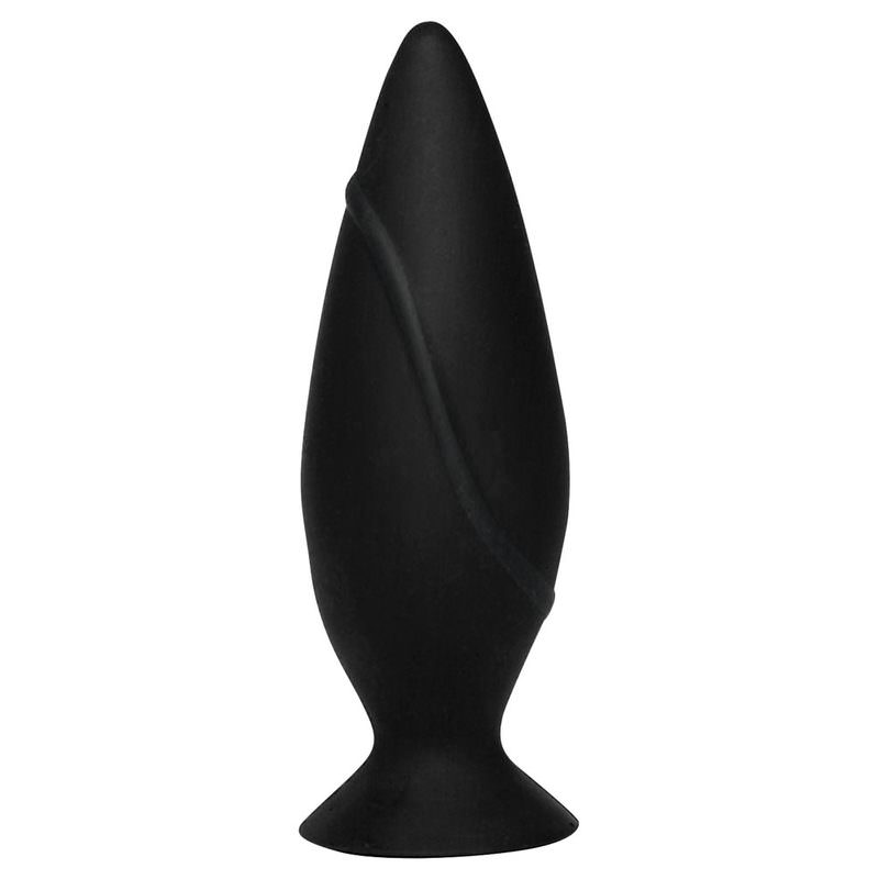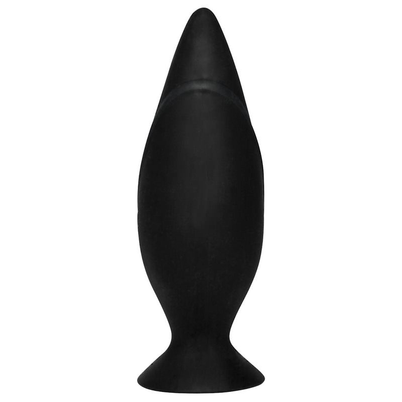 Schwarzer, konisch geformter Analplug mit Saugfuß. Gesamtlänge 9,7 cm, Einführtiefe ca. 8,5 cm. Ø 3,2 cm Material: Silikon.