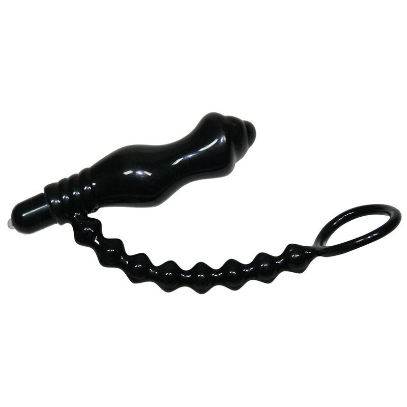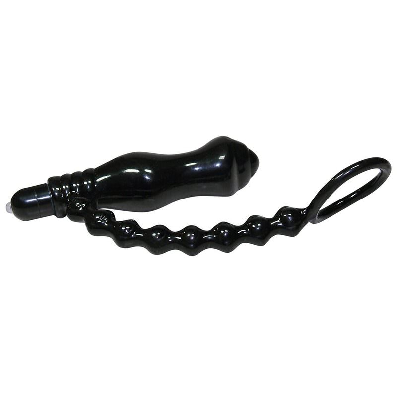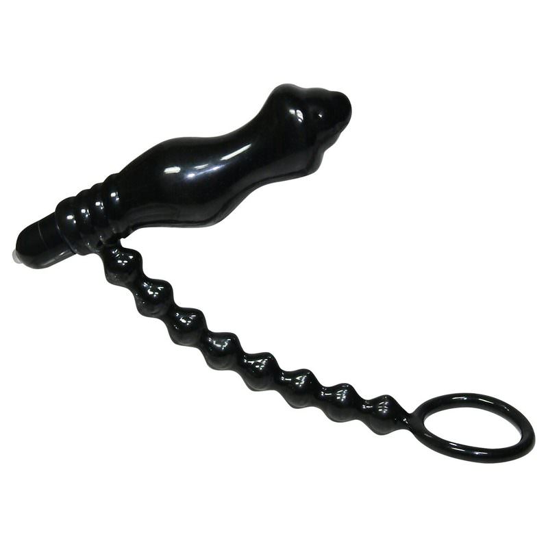 Penisring und Prostata-Vibrator verbunden mit Kugelkette. Der Penisring hält IHN im Zaum, während die Kugelkette am Perineum rubbelt und der Vibrator für irre anale Stimulationen sorgt! Ring-Ø ca. 3,5 cm (leicht dehnbar), Kugelkette 13 cm lang. Anatomisch perfekt geformter Prostata-Vibrator mit 3-Stufen-Vibration 13,5 cm lang, Einführtiefe ca. 9 cm, Ø max. 3,5 cm. Material: PVC. Batterien inklusive.